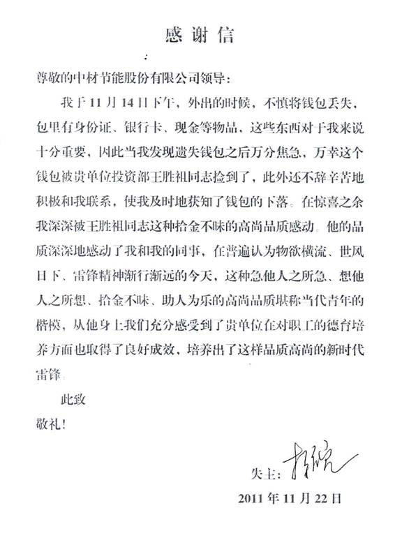拾金不昧是中華民族的傳統(tǒng)美德,也是一個人所具備高尚品質(zhì)和崇高社會責任感的具體體現(xiàn)。2011年11月14日下午,我公司投資部的投資經(jīng)理王勝祖在天津出差時拾到一個錢包,內(nèi)有身份證、現(xiàn)金、銀行卡等重要物品。經(jīng)王勝祖多方查找,最終和失主李京皖先生取得聯(lián)系,并將錢包物歸原主。失主李先生看到自己的錢包失而復得時,當即拿出200元表示感謝卻被王勝祖婉言拒絕。