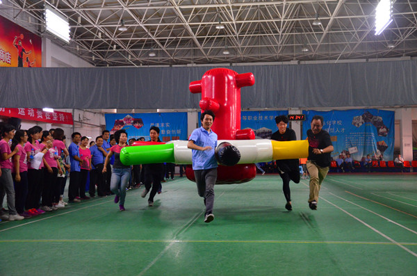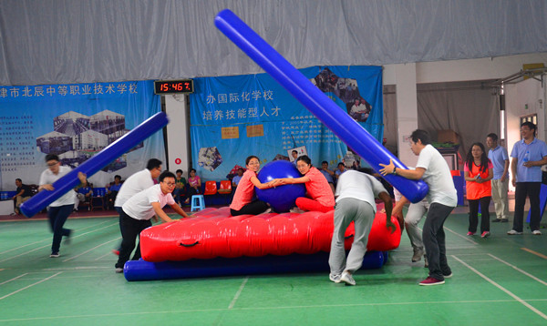 比賽高潮一浪高過一浪。車輪滾滾項目比賽把賽事推向了最高潮,該項比賽不僅拼速度,拼協(xié)作,還要拼認真細致。2人坐在氣墊上面保護氣球不掉下去,4人往前推氣墊前行,2人還要不停的抽換柱子(相當于車輪),如果配合不好,要么氣墊著地,要么車輪變換不及,要么氣球會掉下氣墊。最終技巧與配合默契的設計二隊獲得該項比賽的第一名。